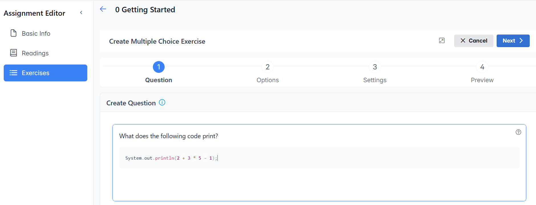 To create multiple choice questions, start or go to any assignment in the Instructor Dashboard "Assignment Builder". In the Exercises section of the assignment, click on "Add Exercise" and select "+ Create New Exercise" and then select "Multiple Choice".