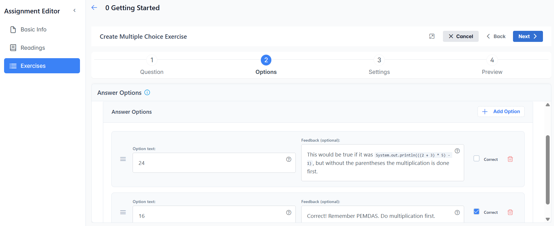Click on Next or 2 to move to the Options tab and enter the multiple choice options. Click on Add Option to add more options. Click on the checkmark next to "Correct" to mark a correct option. You can mark more than one answer as correct. You can also add feedback for each choice that will be shown to the student after they answer the question. Do / and enter to see the format menu or use markdown for each option.