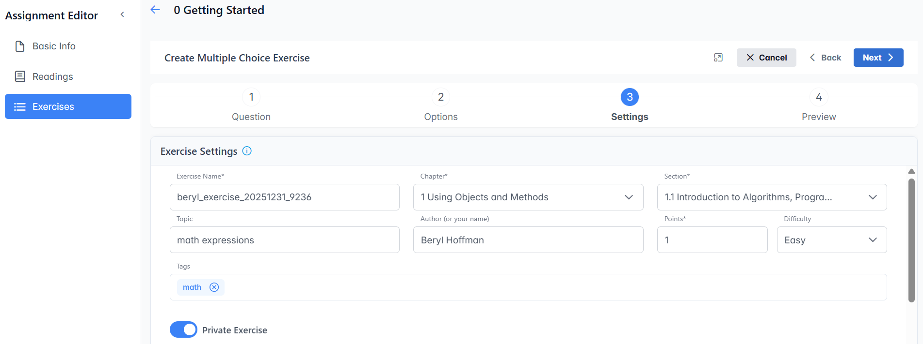 Click on Next or 3 to move to the Settings tab. Here you can set the chapter and section where you want the exercise stored in the assignment builder (where it will show when browsing chapters in the assignment builder), the author, the topic, the number of points for the question, and add tags to help you find the question later. If you change the name of the exercise, make sure it is unique! Some authors put their author names in the exercise name too to make them easier to find. You can also choose to make the exercise private or contribute it to the question bank for other teachers to use. Please make experimental questions private.